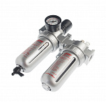 Регулятор давления воздуха с лубрикатором, влагоотделителем и манометром 1/4”. Пропускная способность – 700 л/мин. Давление компрессора 0-12 Бар. Снижает давление между компрессором и пневмоинструментом.