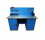 Двухтумбовый. Допустимая нагрузка на столешницу 1000 кг. Опорные элементы выполнены сварными из холоднокатаной стали. Для выполнения сборочных, ремонтных, слесарных, монтажных и других видов работ на производстве, в сервисных центрах, мастерских, гаражах, а также для обучения технологии в учебных заведениях. Комплектуется полкой-стенкой, расположенной под столешницей для удобного размещения габаритного инструмента и оснастки. Размеры верстака: 855x1596x696 мм. Вес: 120 кг. Поставляется в 4 комплектациях на выбор.
