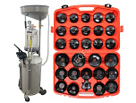 Комплект из TS-2097 маслосборника. Для быстрого слива и откачки щупами масла и антифриза из ДВС, КПП и дифференциалов всех авто. В комплекте: Колба с особо прочным пластиком. Сливная чаша с сеткой для улавливания мелких деталей. Щупы гибкие 6 шт. Лоток для сливной пробки. Прозрачная трубка контроля в защитном кожухе. Металлические пистолеты для откачки масла. Вмещает 90 л. = Бак 70л + колба 10 л. +  сливная воронка 10л  + ES0903 Набор съемников масляных фильтров ("чашки") - 30 шт.