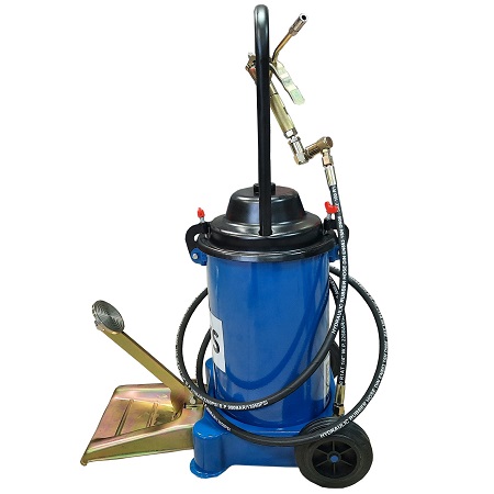 Пневматический. На колесах. Продавливает «ЗАБИТЫЕ» тавотницы. Давление смазки 300-400 Атм. Пистолет с наконечником производительность 850 г/мин. Для шприцевания шарнирных соединений (тавотниц, крестовин, подшипников, цепей). Заправка смазкой из ведра, тубы, бочки. Высота бака 320 мм. Диаметр бака Ø 220 мм. Длина шланга 4 м. Емкость бака 12 кг.