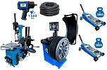Комплект: шиномонтажный станок TS-21 для дисков: внешний 11÷20” + пистолет с манометром для подкачки шин + монтажка + пластиковые накладки на зажимные кулачки + регулятор давления с влагоотделителем и манометром. + TS-500 балансировочный станок с автозапуском, для колес легковых автомобилей и легких грузовиков, диаметр диска с резиной до 760 мм. размеры диска: ширина 3"–9” (76-228 мм), диаметр диска  10"–21” (254-533 мм). + кожух защитный + клещи + кронциркуль + быстрозажимная гайка + набор конусов + подкатной домкрат г/п 3,0т. 130-465мм. + ударный пневмогайковерт 1/2" крутящий момент 745Нм +  шланг кислородный 9мм 20Атм. 10м