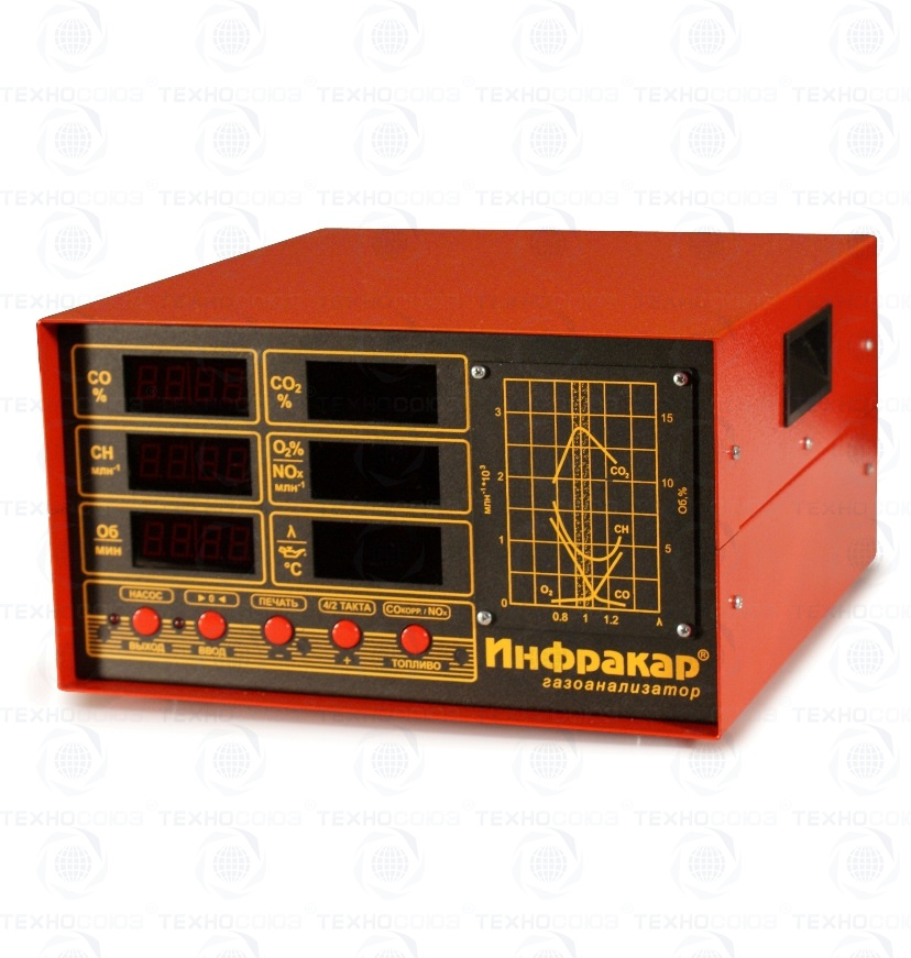 Автомобильный 5-ти компонентный газоанализатор Инфракар 5М-2Т.01 предназначен для измерения объемной доли оксида углерода (СО), углеводородов (CН) (в пересчете на гексан), диоксида углерода (СО2), кислорода (О2), окислы азота(NOx) в отработавших газах автомобилей с бензиновыми двигателями. Лямбда + Тахометр + RS-232 + Температура масла + Автослив конденсата + Автоподстройка нуля + Работа с ЛТК и мотортестерами. Внесен в Госреестре средств измерений РФ, Республики Беларусь и Казахстан.