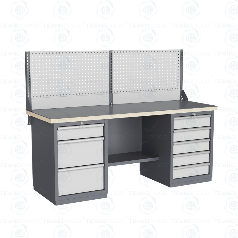 Двухтумбовый. Для выполнения тяжелых сборочных, слесарных и других видов работ на производстве, для установки в закрытых помещениях. Допустимая нагрузка на столешницу 3000 кг. Тумбы и опоры верстаков выполнены из профилированной холоднокатаной стали и имеют сварную конструкцию. На тумбы с выдвижными ящиками установлена система антиопрокидывания. В ящиках качественные усиленные шариковые направляющие полного выдвижения. Верстак покрыт ударопрочной и износостойкой порошковой краской. Для комфортной работы стоя и сидя. Размеры: 870x1993x743 мм. Поставляется в 4 комплектациях на выбор.