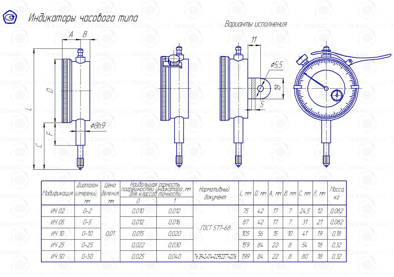 Индикаторы часового типа с ценой деления 0,01 мм. Диапазон измерения от 0-25 мм. Предназначены для абсолютных и относительных измерений линейных размеров, определения величины отклонений от заданной геометрической формы и взаимного расположения поверхностей. Класс точности 0. ГОСТ 577-68. Поставляется в двух вариантах с поверкой и без поверки!