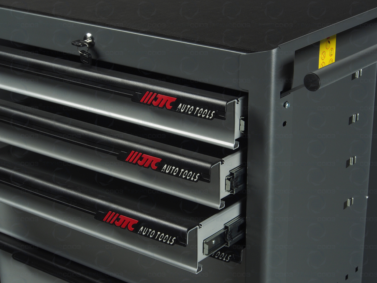 • Перфорированные внутренние стенки боковых ящиков с квадратными отверстиями предоставляют возможность разместить дополнительные аксессуары для хранения инструментов. Применяется с серией подвесных приспособлений JTC-3218.