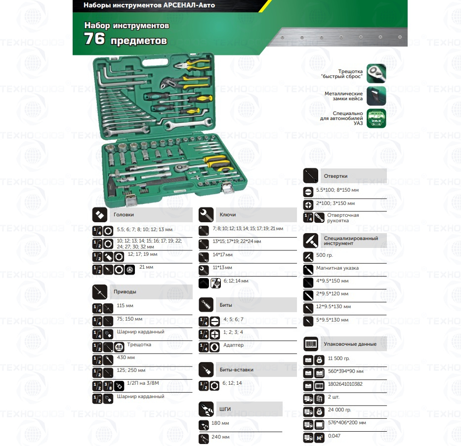 Набор инструментов для УАЗ 76 предметов Арсенал AA-C1412P76 специально разработан для автомобилей марки УАЗ. Оптимально подобранный ассортимент головок, ключей, шарнирно-губцевого инструмента и отверток позволит обслуживать и ремонтировать автомобиль самостоятельно. Сталь, из которой изготовлен инструмент, легирована хромом и ванадием с нанесением никелевого покрытия. Крепкий кейс из ударопрочной пластмассы. Наборы инструментов Арсенал имеют пожизненную гарантию. Инструмент Арсенал - Специально разработан для Российских условий!!!