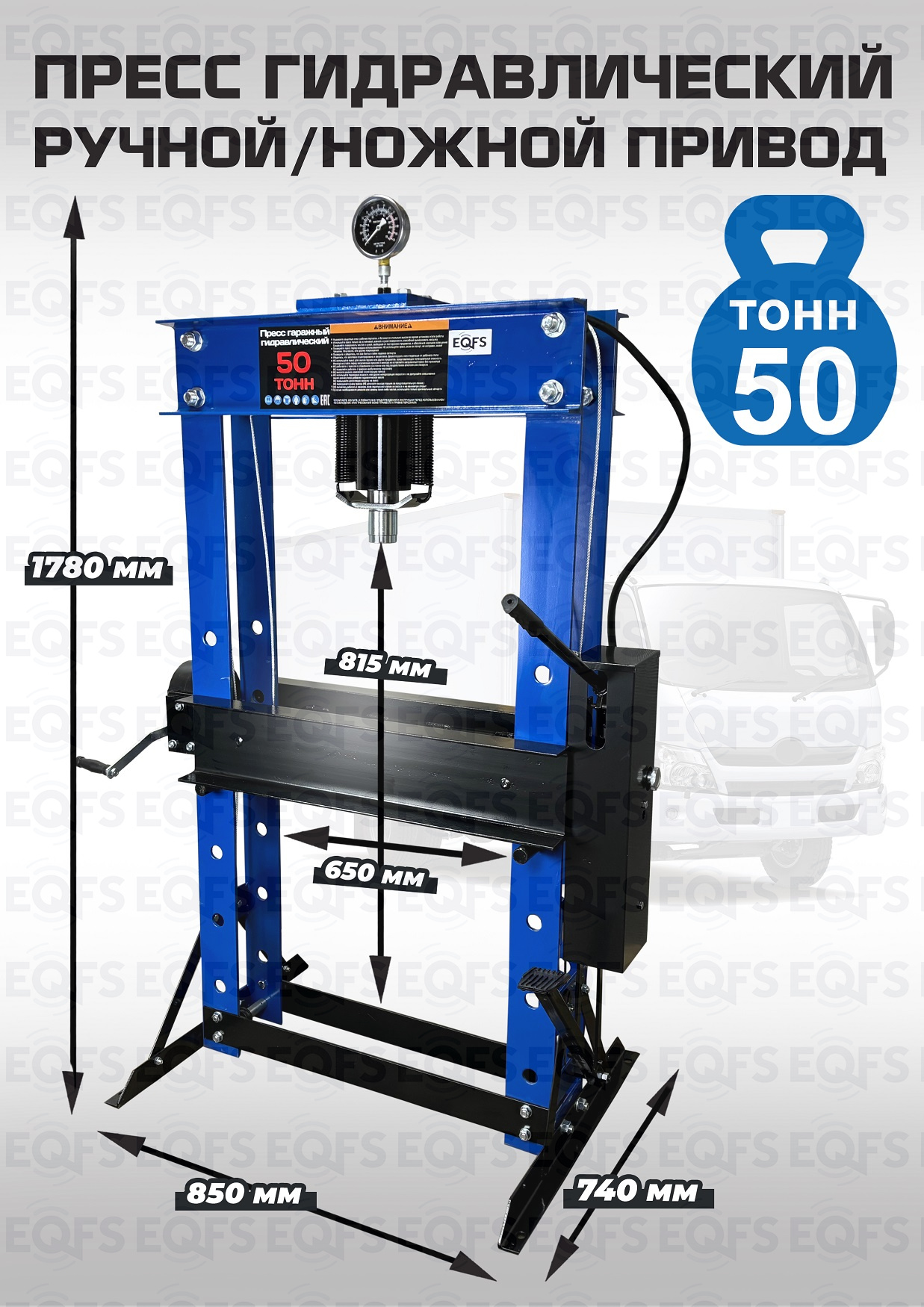 Пресс гидравлический 50 тонн ножной / ручной для автосервиса, усилие 50 тонн. «Свободные руки». ножной / ручной. Пуансон 0-230 мм. Рабочее окно 650х815 мм. Доставка по РФ и ТС. Поршень приводится в действие нажатием на ручку или педаль. Рекомендуется для выпрессовки подшипников, деталей машин, втулок и т.п. в автосервисе, гараже и СТО. Цвет синий.