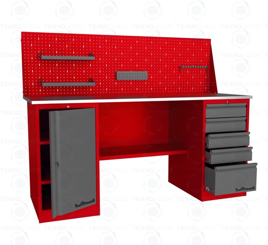 Верстак металлический двухтумбовый 1 тумба - 5 ящиков, 1 тумба с ящиками и  дверью, ц. замок, полка, оцинк. столешн. h=24 мм (фанера+оцинкованный металл 1мм). Размеры (ВхШхГ)    870х1800х700 мм. Вес 115 кг. Нагрузка на столешницу 300кг.