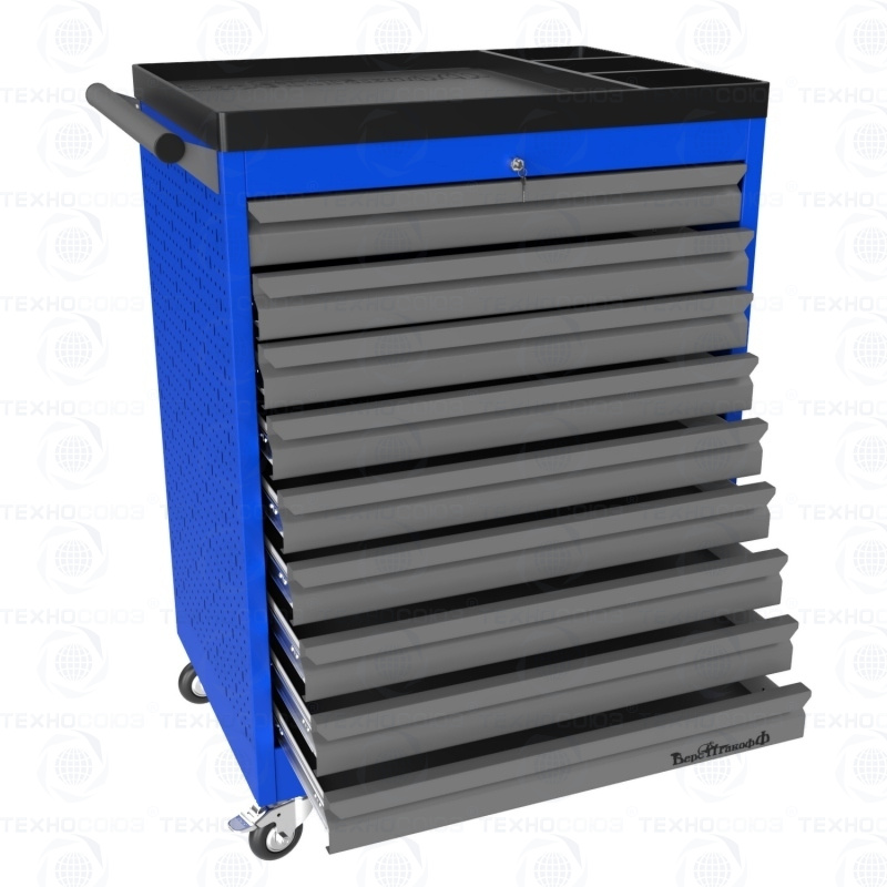Тележки инструментальные серии PROFFI 950 предназначены для использования на предприятиях любого профиля занятых ремонтом и изготовлением различной продукции. На боковые стенки инструментальной тележки нанесена перфорация размером 25х25 мм и диаметром отверстия 8 мм, что позволяет устанавливать на них навесной инструмент или крючки. Наибольшей популярностью тележки инструментальные пользуются в сфере авторемонта и обслуживания автомобилей .Тележки имеют выдвижные ящики на шариковых телескопических направляющих полного выдвижения с фиксацией в закрытом положении, предотвращающее открывание при передвижении тележки. Ящики имеют центральный замок, который позволяет ограничить доступ посторонних лиц к содержимому ящиков. Тележка инструментальная изготовлена из высококачественного металла ведущих Российских производителей, покрашена порошковой краской производства Германии, имеет итальянскую и турецкую фурнитуру. Тележки для инструмента оснащены двумя не поворотными колесами диаметром 100 мм, одним поворотным и одним поворотным со стопором, которое фиксирует тележку и предотвращает непроизвольное скатывание.