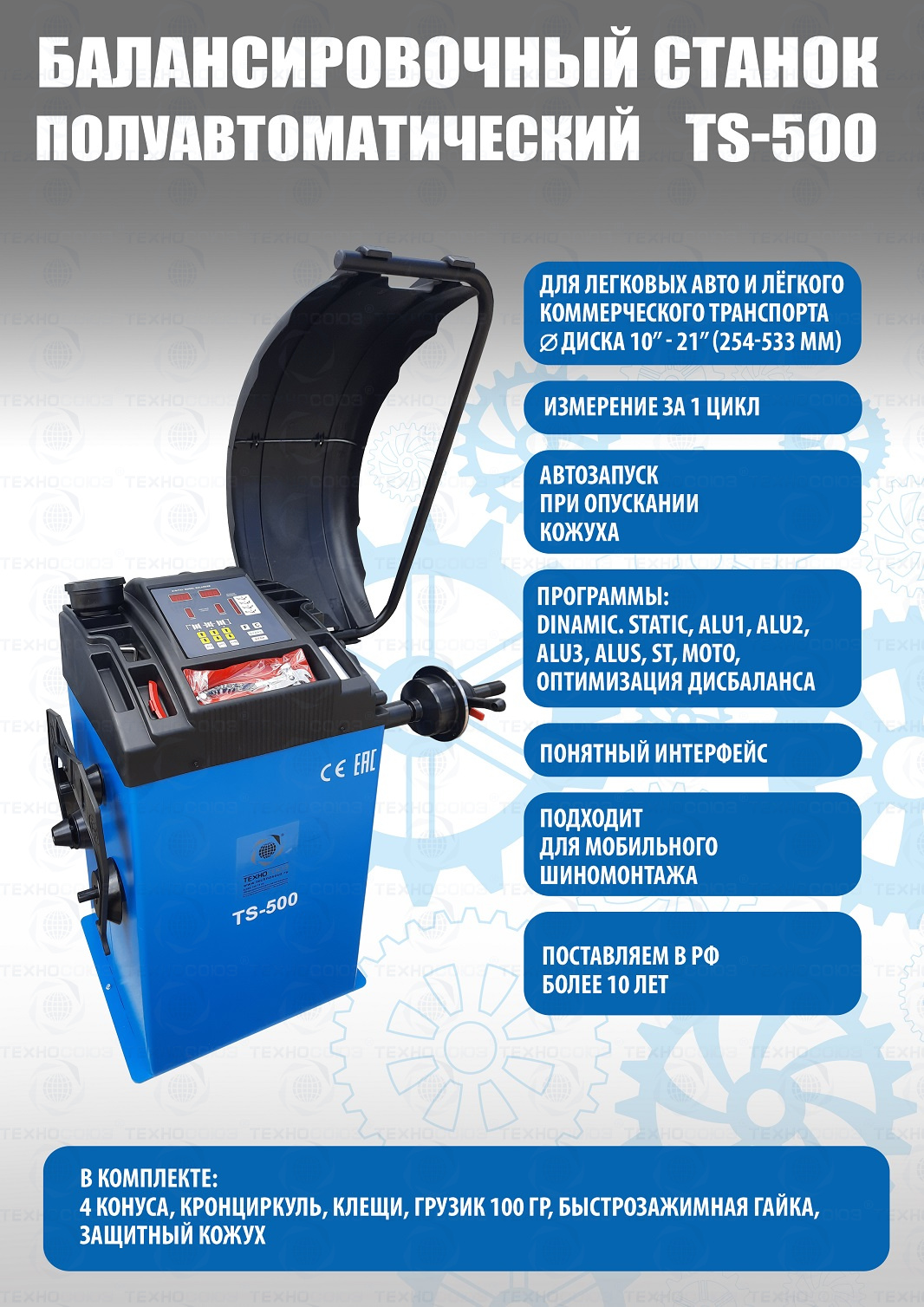 + TS-500 Балансировочный станок для колес легковых автомобилей, мотоциклов и легких грузовиков. В комплекте: кожух с автозапуском + клещи + кронциркуль + быстрозажимная гайка + набор конусов. Для балансировки для колес легковых автомобилей, мотоциклов и легких грузовиков с диаметром диска с резиной до 760 мм. Размеры диска: ширина 3–9” (76-228 мм) , диаметр диска" -  10–21” (254-533 мм). Вал-36 мм. Максимальный вес колеса с диском – 65 кг. Точность ±1гр. Напряжение 220В. C кожухом.  Напряжение 220В. позволяет производить шиномонтаж и балансировку колес. Данные станки возим более 10 лет. Надежные - не подведут в сезон!!!  Напряжение шиномонтажных станков 220В или 380В на выбор.