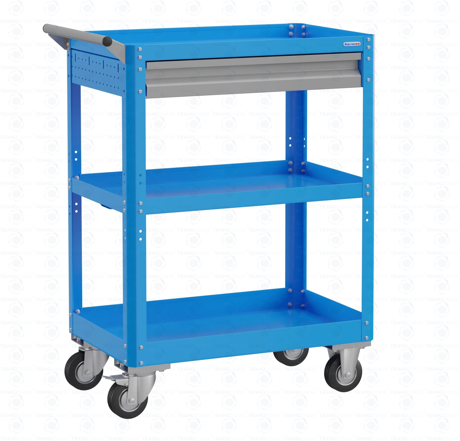 Корпус выполнен из листовой стали толщиной от 0,6 до 1,5 мм., покрыт полимерной порошковой краской.  С выдвижным ящиком на шариковых телескопических направляющих. Общая равномерно-распределённая нагрузка на тележку - до 100 кг. Верхняя и средняя полка имеют высоту борта 40 мм., нижняя полка имеет высоту борта 60 мм. Размер 950х700х450 мм.