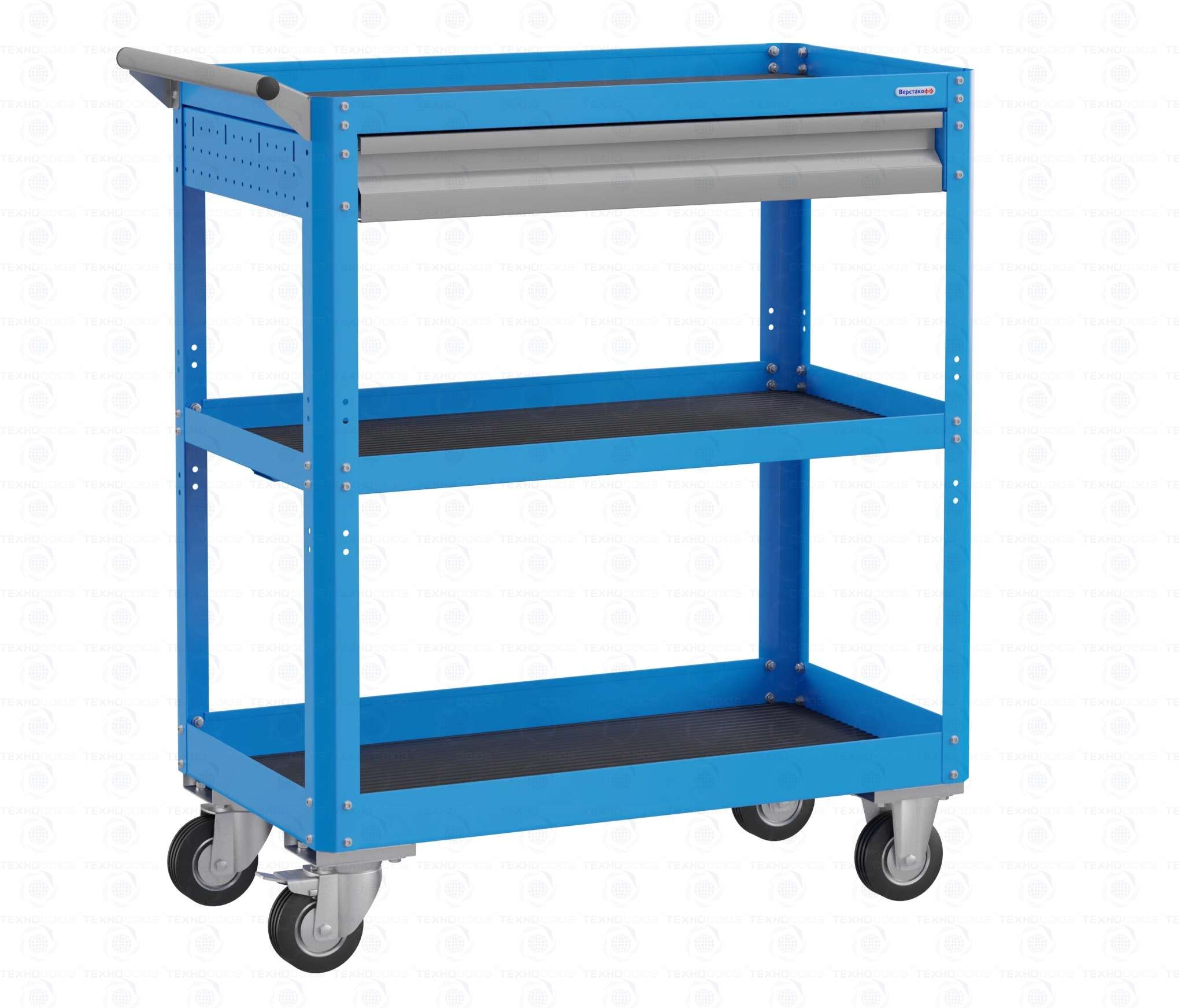 Корпус выполнен из листовой стали толщиной от 0,6 до 1,5мм., покрыт полимерной порошковой краской. С выдвижным ящиком на шариковых телескопических направляющих. Комплект резиновых ковриков. Общая равномерно-распределённая нагрузка на тележку - до 100кг. Верхняя и средняя полка имеют высоту борта 40 мм., нижняя полка имеет высоту борта 60 мм. Размер 950х800х450 мм.