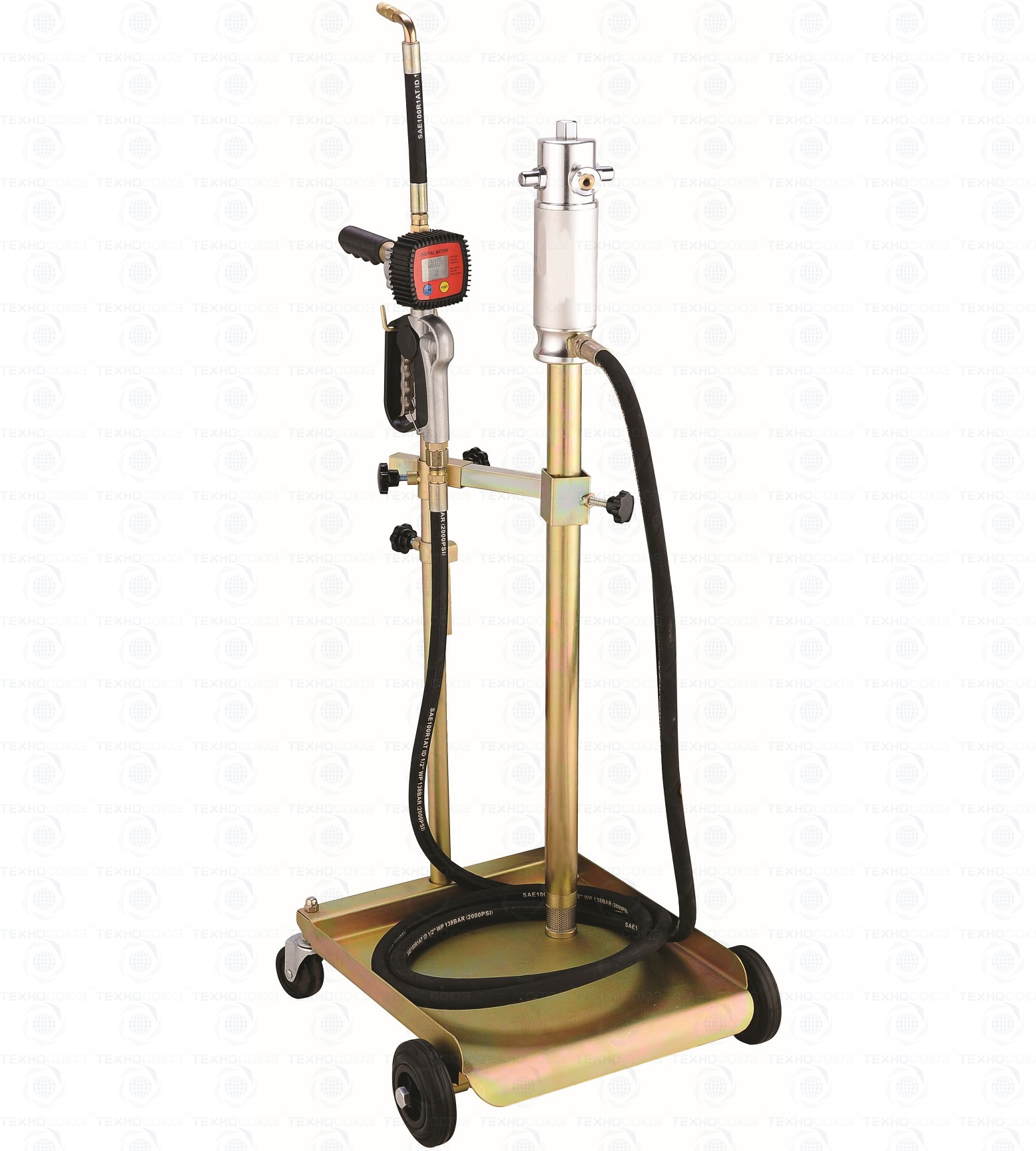 Для бочек 20-60 кг. Установка оснащена тележкой, пневматический насос для масла 3:1 производительность 18л/мин, шланг 4 м, раздаточный пистолет с электронным счетчиком.  Колёса 2 прямых + 2 поворотных. Масса: 25,5 кг.