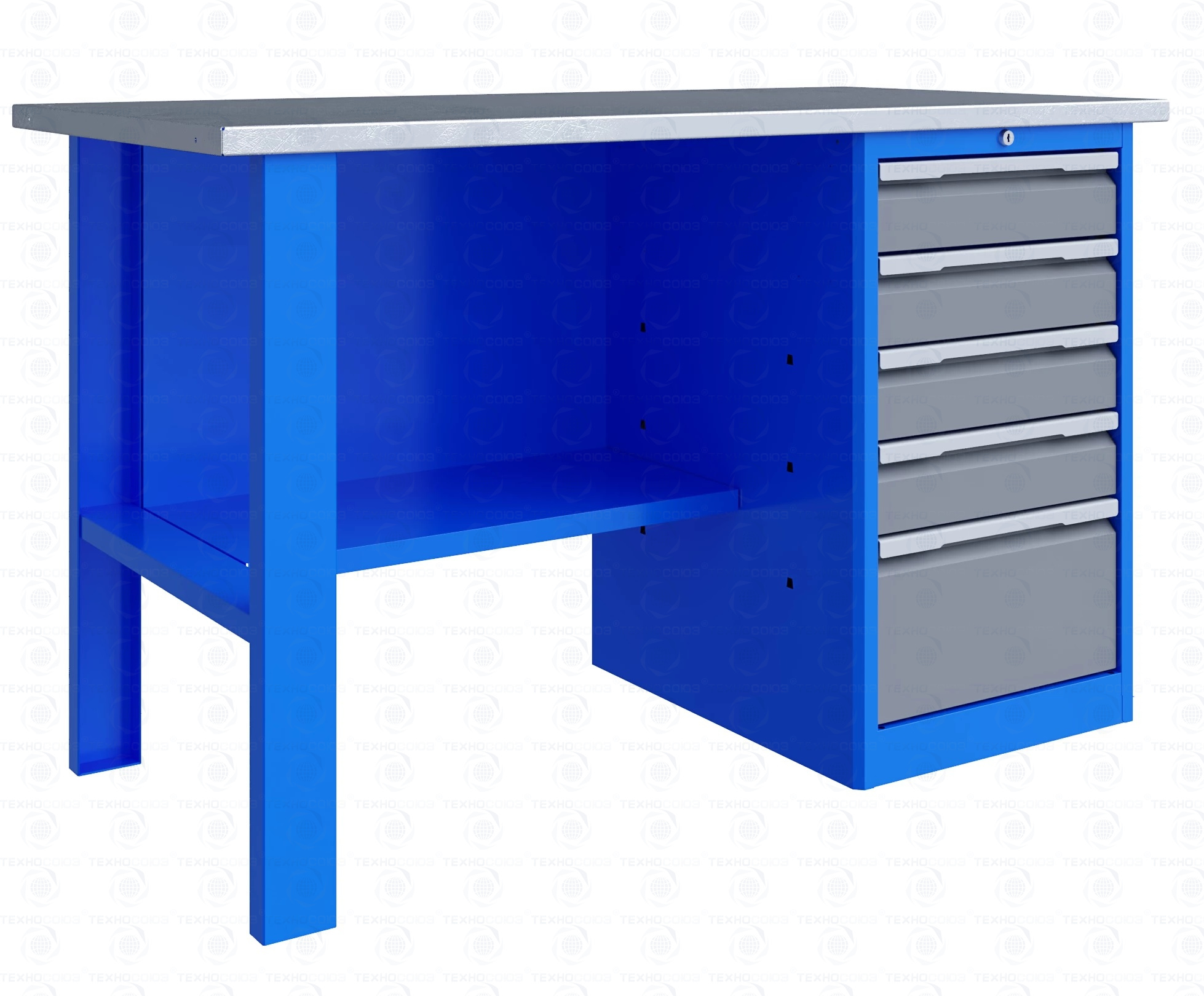 Тумба верстака - сварная. Ящики в тумбе устанавливаются на шариковых телескопических направляющих полного выдвижения. В тумбе P5 установлено четыре малых и один большой ящика. Внутренние размеры малых ящиков (ВхШхГ), не более: 103 х 397 х 520 мм. Внутренние размеры больших ящиков (ВхШхГ), не более: 222 х 397 х 520 мм. Тумбы с ящиками снабжены общим центральным замком с поворотом ригеля 180 градусов и подпружиненной тягой. В комплекте два ключа.
