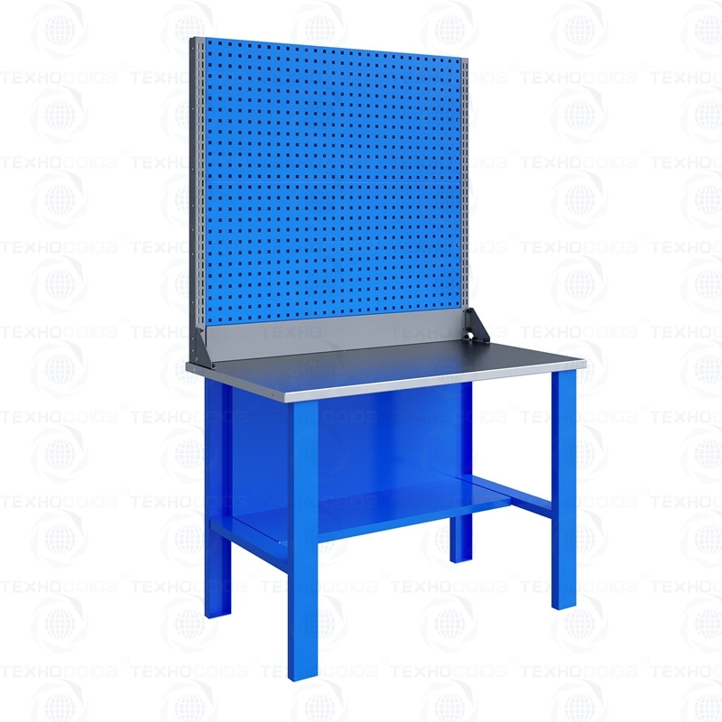 Верстак комплектуется полкой-стенкой, расположенной под столешницей для удобного размещения габаритного инструмента и оснастки.