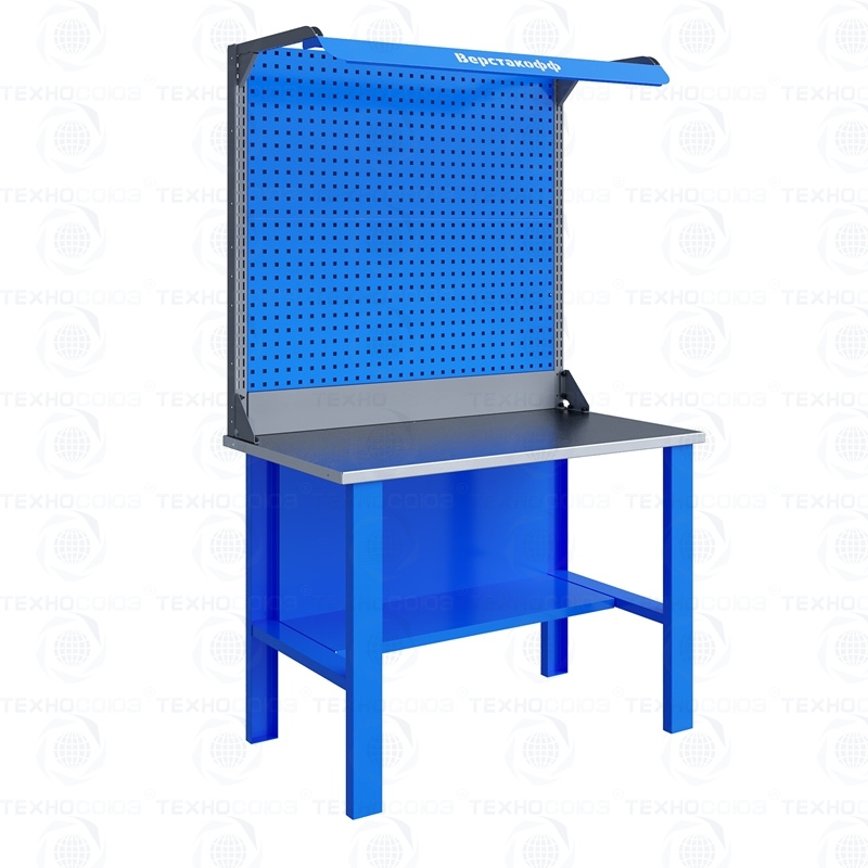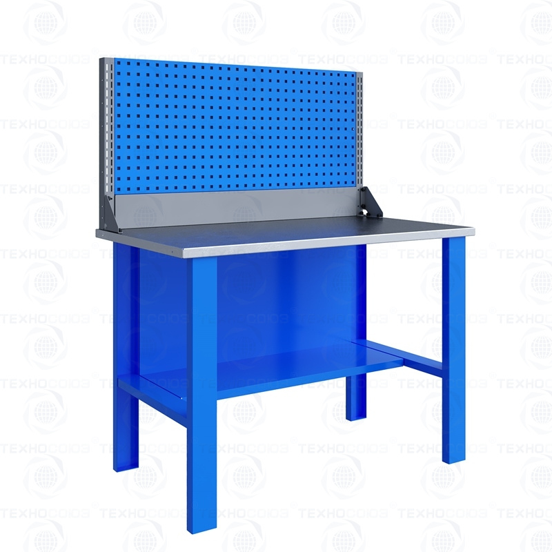 Бестумбовый. Допустимая нагрузка на столешницу 350 кг. Опорные элементы выполнены сварными из холоднокатаной стали. Для выполнения сборочных, ремонтных, слесарных, монтажных и других видов работ на производстве, в сервисных центрах, мастерских, гаражах, а также для обучения технологии в учебных заведениях. Комплектуется полкой-стенкой, расположенной под столешницей для удобного размещения габаритного инструмента и оснастки. Размеры верстака: 855x1196x696 мм. Вес: 38 кг. Поставляется в 4 комплектациях на выбор.