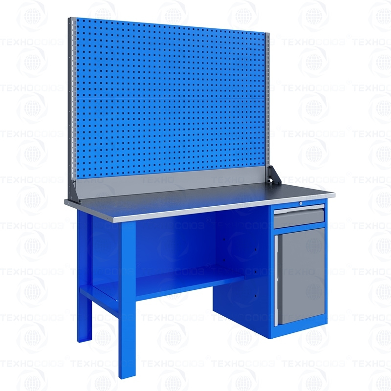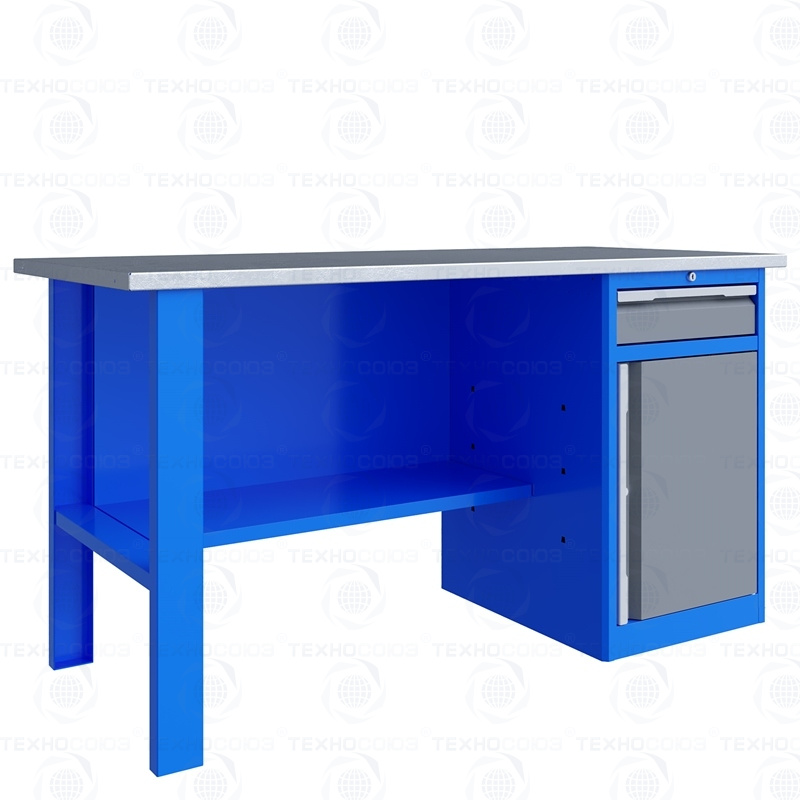Однотумбовый. Допустимая нагрузка на столешницу 750 кг. Опорные элементы выполнены сварными из холоднокатаной стали. Для выполнения сборочных, ремонтных, слесарных, монтажных и других видов работ на производстве, в сервисных центрах, мастерских, гаражах, а также для обучения технологии в учебных заведениях. Комплектуется полкой-стенкой, расположенной под столешницей для удобного размещения габаритного инструмента и оснастки. Размеры верстака: 855x1596x696 мм. Вес: 68 кг. Поставляется в 4 комплектациях на выбор.